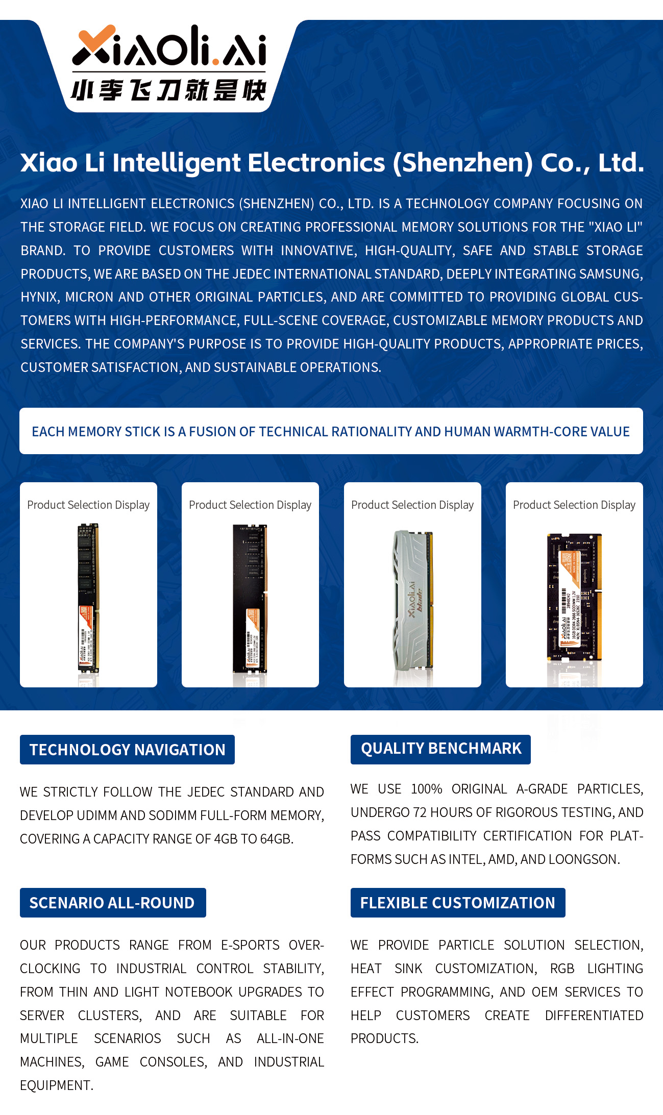 Xiaoli AI Electronics (Shenzhen) Co., Ltd. is a leading technology company focusing on the memory and storage solutions. We are committed to R&D, production and sales of high-quality memory and storage products, including memory modules, solid-state drives, memory cards, USB flash drives, etc. With years of experience and expertise, we can provide high-performance, high-reliability memory and storage solutions for various users around the world. 图片 ECOM Authorized Products